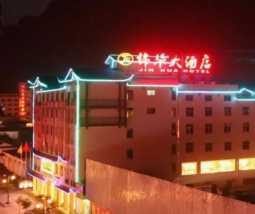 武陵源錦華大酒店是一家按國家四星級標(biāo)準(zhǔn)、2009年5月新修建成的豪華旅游度假酒店,地理位置優(yōu)越,位于武陵源汽車站旁.酒店集觀光旅游、度假、商務(wù)會議、品嘗土家美食等多功能為一體,酒店建筑融合張家界地區(qū)的民族風(fēng)情和建筑文化,是張家界地區(qū)最有土家風(fēng)情的星級酒店之一。 武陵源錦華大酒店安裝了數(shù)控中央空調(diào)系統(tǒng)、空氣源熱水系統(tǒng)。24小時(shí)供應(yīng)冷熱水。 武陵源錦華大酒店擁有客房100間,其中套房3間、標(biāo)準(zhǔn)間96間、單人間1間,客房內(nèi)配有液晶電視、閉路電視和寬帶接口;餐要包廂8個(gè)、豪華包相一個(gè)、極具當(dāng)?shù)靥厣摹盎鹂游荨卑鼛?個(gè)、中餐宴會廳可同時(shí)容納300人就餐。酒店還配備一個(gè)高標(biāo)準(zhǔn)多功能的現(xiàn)代化會議室,安裝有電視電話會議系統(tǒng),可以舉行各種類型的中小型會議。