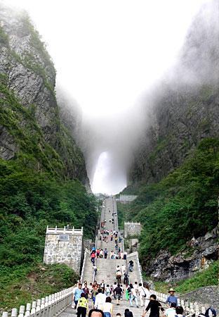 選擇乘索道游覽天門山是最佳視角。索道吊廂一出站房,馬上就騰空飛了起來,從城市的一棟棟樓頂掠過,猶如在城市上空滑翔。翻過一道山梁之后,城市被遠遠拋在了視線以外,大片翠綠的稻田映入眼簾,透過打開的通風(fēng)窗口,一陣陣青草水田特有的清香沁入心脾。或高或低的農(nóng)舍不時從我們身下滑過,牛羊們?nèi)齼蓛捎崎e的在田間浮動著,靜謐、安詳。再翻過一座山峰,我們便立即被滿山的青翠所包圍,萬仞絕壁也已投懷送抱。索道支架矗立于絕壁天險中,或挺立或傾倒或探頭或擁抱,我們繼續(xù)在艱險中游歷,時而隱沒于云堆,時而出世于蒼穹。這時你除了那滿懷的驚險刺激外有的便只有望索而興嘆了。我拍了很多片子,但是總覺得還是沒有足以記錄下來這座空中盆景的壯麗。