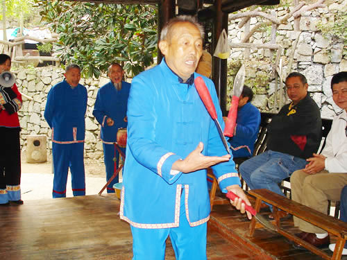 三棒鼓,唐代稱三仗鼓,約于明代傳入張家界,并逐漸成為群眾喜聞樂見的民間藝術(shù)形式。每年春節(jié),藝人們結(jié)伴走村串寨拜年,表現(xiàn)對(duì)象不分貧富,戶戶必到。如遇貧寒之家,表演者將別家贈(zèng)送的禮品相送,意在人人過節(jié)歡喜。充分體現(xiàn)出土家人熱情好客,心地善良的民族性格。對(duì)加強(qiáng)民族間團(tuán)結(jié)有一定的作用。三棒鼓 通常由三至五人組成,一人擊鼓唱詞,一人鑼鼓配樂,一人;ò。花棒三根,長(zhǎng)一尺,舞者左右 各執(zhí)一根,將另一根拋在空中,左右開弓,擊打空中花棒使之不落地。也有以刀代棒,以五刀代三棒的技藝。鋼刀在空中歡跳,銀光閃閃,左右穿梭。技藝高強(qiáng)者,突然把刀拋得及高,來一個(gè)騰空飛腳,轉(zhuǎn)身外擺,繼續(xù)接刀上拋,令人眼花繚亂,不禁稱絕。打三棒鼓,通常有“鬧春耕”、“收割打場(chǎng)”、“慶豐收”、“拜年節(jié)”四套,分“鯉魚跳龍門”、“玉女穿梭”、“板巖漂灘”等項(xiàng)目。打三棒鼓技巧性強(qiáng),表演時(shí)需高度集中,用力適當(dāng),貫通一氣,并與演唱者默契配合。