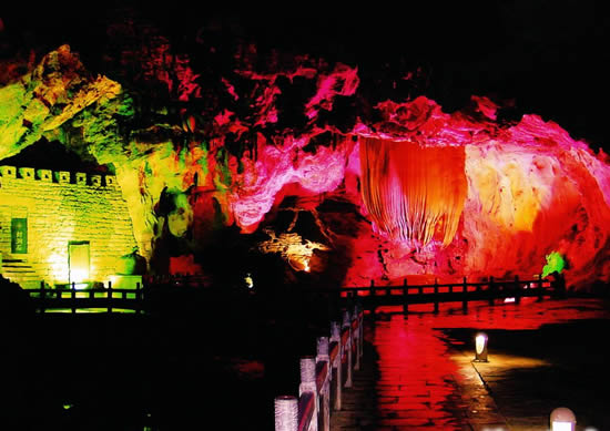 奇梁洞位于縣城北四公里處,屬典型的碳酸鹽巖洞,該洞以奇、秀、闊、幽四大特色著稱。洞長6000余米,共分五大景區(qū):即古戰(zhàn)場、畫廊、天堂、龍宮和陰陽河。洞中有山,奇梁洞圖片山中有洞,洞洞相連。它集奇巖巧石,流泉飛瀑于一洞,由千姿百態(tài)的石筍、石柱、石鐘乳構(gòu)成了一幅幅無比瑰麗的畫卷。一條小溪穿洞而過,水流平緩,燈光打在巖壁上,皺襞倒影在水中,如夢如幻。巖洞用五光十色的霓虹燈打在石筍、石幔及石花上,營造出一個(gè)流光溢彩的世界。在洞內(nèi)有一大廳,據(jù)傳是苗民糾集的地方,廳里立著一塊帶一個(gè)小孔的石頭,對著小孔“嗚嗚”地吹,整個(gè)大廳會回蕩著低沉的號角聲,當(dāng)年的苗民就是用這種方式傳令的。