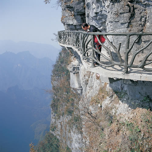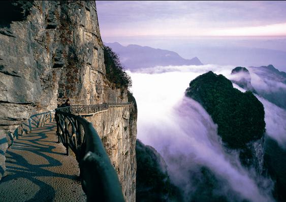 天門山鬼谷棧道圖片 棧道全長1600米,平均海拔為1400米,起點是倚虹關(guān),終點到小天門。與其他棧道不同的是,鬼谷棧道全線既不在懸崖之巔,也不在懸崖之側(cè),而是全線都立于萬丈懸崖的中間,給人以與懸崖共起伏同屈伸的感覺。