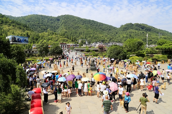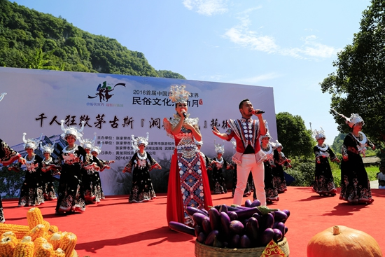 7月29日上午9點30分,由張家界市人民政府主辦,張家界市委宣傳部、市旅游和外事僑務(wù)委員會、市文體廣電新聞出版局、武陵源區(qū)人民政府承辦,黃龍洞景區(qū)協(xié)辦的“絕版張家界,最炫民族風(fēng)”張家界民俗活動月第三場活動在黃龍洞景區(qū)啟動,F(xiàn)場以土家人慶祝豐收的鼓舞拉開序幕,土家鼓舞歡悅的節(jié)奏,夸張的舞姿開場就吸引了幾千游人和當(dāng)?shù)厝擞^看。草根夫妻檔歌手,張家界“山水組合許勇、舒維亮麗的服飾,野性的嗓音……”以一首《我在高山唱》歌曲,征服現(xiàn)場游客,贏得雷鳴般的叫好聲。
