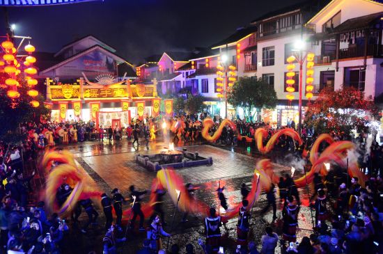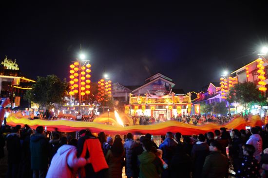 | 火龍出場,街區(qū)狂舞;盤龍點睛,眾人祈福。12月21日,農(nóng)歷冬至,當天夜晚在旅游勝地張家界武陵源區(qū)溪布老街擺手堂廣場啟動的 “武陵腔調(diào):趕火趕戲趕大年”活動儀式上,一條全身似火的長龍在近百名土家兒女的舞動下 “閃亮”登場,格外耀眼。據(jù)了解,這條長龍身有香味,全長108米,是目前世界最長的香火龍。