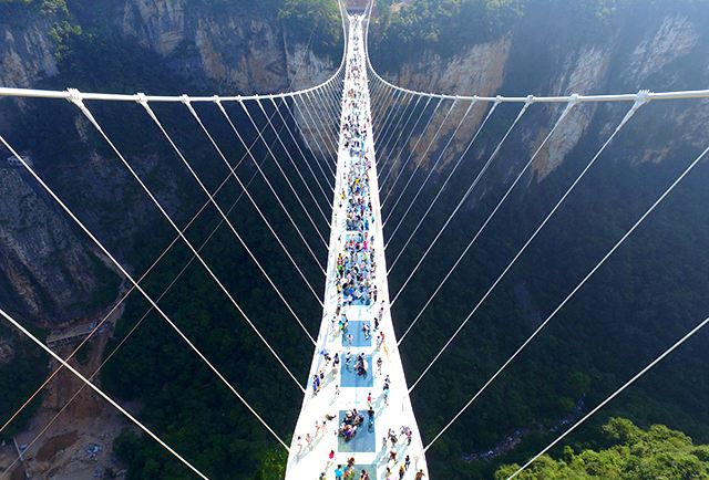 張家界大峽谷玻璃橋橋面由99塊全透明玻璃鋪設(shè),橋面總長430米、寬6米,距谷底相對高度約300米,游客走在橋上就可以清楚地看到腳下的懸崖峭壁,好似行在空中,非常刺激,被美國有線電視新聞網(wǎng)列入世界上11座最壯觀的橋之一。目前,張家界大峽谷玻璃橋已經(jīng)成為世界旅游的一張響亮名片。