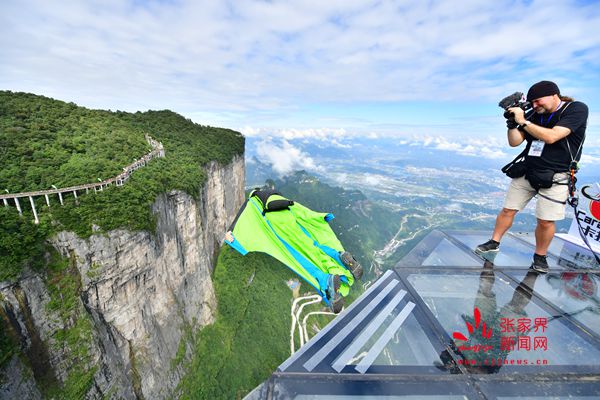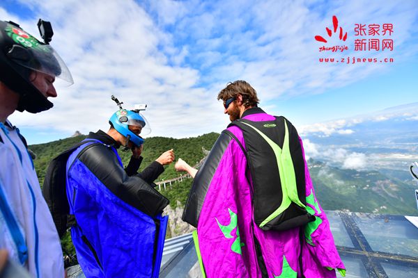2017世界翼裝飛行世錦賽將于9月8日-10日在張家界天門山舉辦。開賽在即,9月7日上午,來自全球11個國家的16名翼裝飛行員從海撥1458米的張家界天門山玉壺峰頂一躍而下,在奇峰險壑間進行競速訓練。